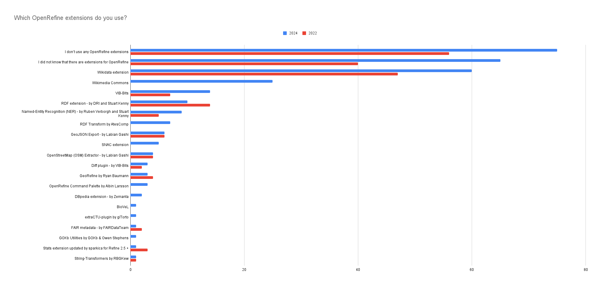 In 2024, reconciliation services continued to rise in popularity, with over 30 endpoints reported. OpenRefine comes with Wikidata as the default reconciliation server, which remains the most used, boasting 109 users (or 43.95% of OpenRefine users). The Commons extension increased in popularity, growing from 6 users in 2022 to 29 users in 2024, and became the second most used endpoint.